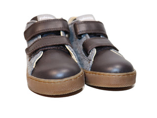 Felt uppers with a chocolate brown Nappa accent. Double velcro opening ensures a secure fit all of the time. Gum rubber outsole for additional traction.
