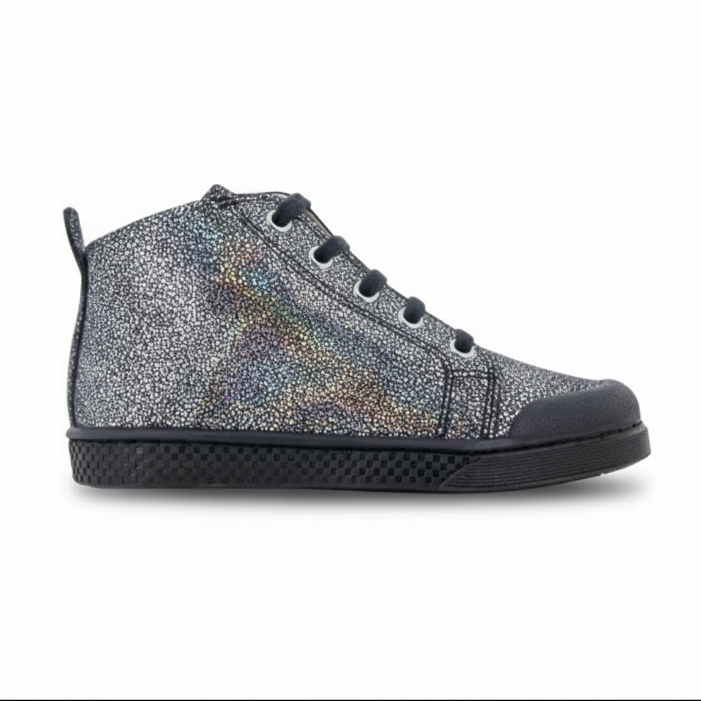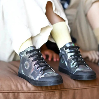 This high-top lace-up sneaker for children is presented in an iridescent black leather, perfect for any occasion weather paired with a dress of cool jeans. It is flexible and durable snf designed with quality materials.
